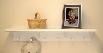 An attractive and functional shelf for the home or office to hang coats with a shelf for hats, mittens or purses. A raised strip at the front of the shelf keeps things in place on the shelf. Great for the home entry or dressing room, for the office, or in waiting rooms.